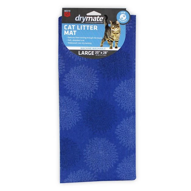Reduce the amount of litter your paw-tner tracks with the Drymate Good Medicine Cat Litter Mat. Made with soft material, this absorbent mat cleans litter from the paws of your furry friend as she steps on it. The waterproof, non-slip backing keeps it in place and protects against accidents soaking through and messing up your floors. This mat is also machine washable for easy cleaning. Drymate Good Medicine Cat Litter Mat is constructed in the USA from over 50% recycled fibers for those pet parents that are eco-conscience.