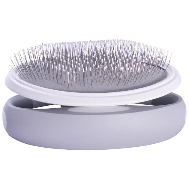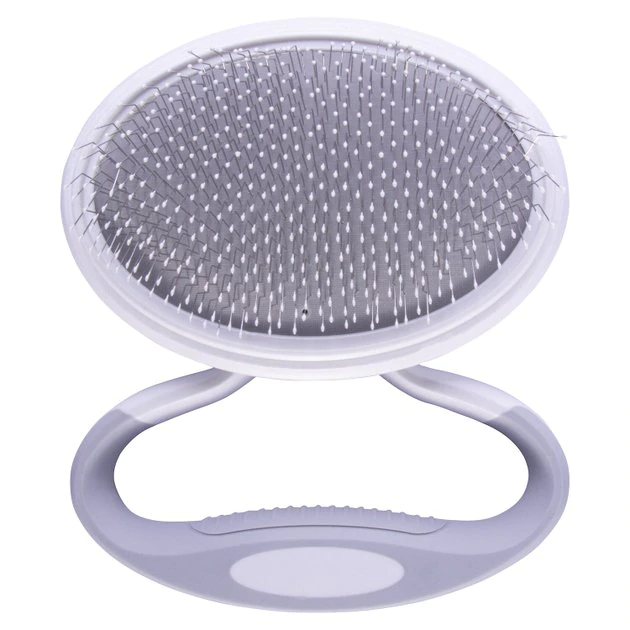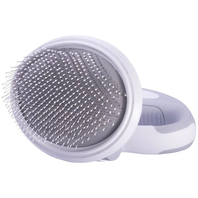 Try a new angle on grooming with the Pet Life Gyrater Travel Swivel Dog & Cat Grooming Slicker Brush. This innovative slicker brush features a customizable handle that you can reposition at any angle you need. Simply squeeze the handle release buttons to swivel the brush and release them to lock it into the right position. Palm and knuckle handle grip options, and a soft contoured inner surface, provide comfort and control during brushing. The brush’s fine-wired bristles easily remove mats and tangles from medium-to-long, or curly hair—perfect for use with both dogs and cats. The stainless steel brush pins are connected to an air cushion for a smoother brushing experience that is easier on hair. A compact design lets you take this brush anywhere you need it, too!