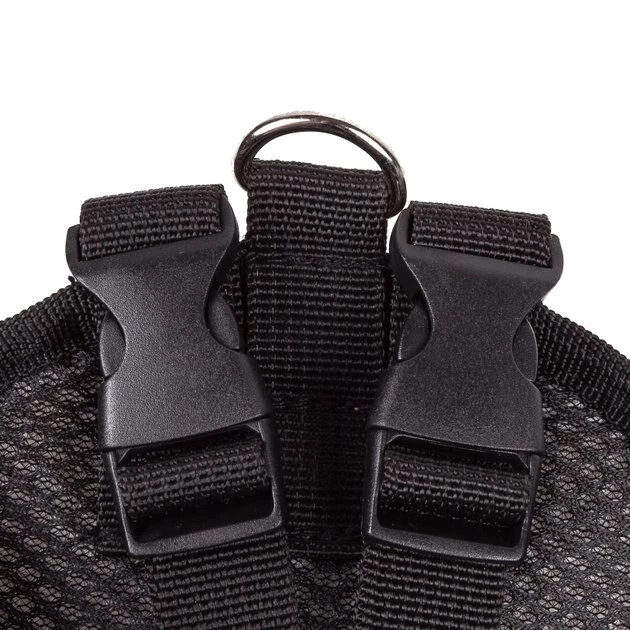 - Equipped with a stainless-steel harness ring, dual buckles and heavy-duty adjustable nylon straps.