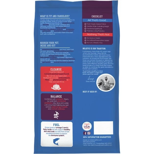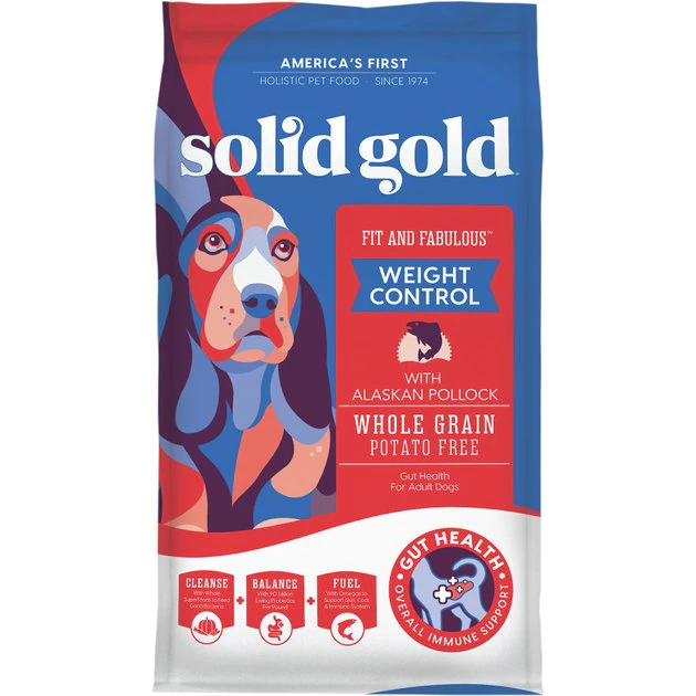 Help your furry friend keep off the extra pounds with Solid Gold Fit & Fabulous Low Fat/Low Calorie with Fresh Caught Alaskan Pollock Adult Dry Dog Food. This low-fat formula features fresh-caught, omega-rich Alaskan pollock, probiotics and a unique blend of functional superfoods for gut health and overall immune support. It contains brown rice and pearled barley for a rich source of fiber, B vitamins and minerals to keep your pup happy. This diet is also free of potato, corn, wheat, soy and artificial preservatives because your paw-tner deserves nothing but the best. Consider this weight control food from Solid Gold as a nutritious and delicious option for your companion.