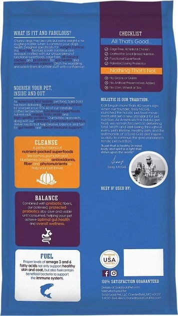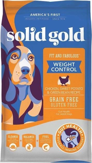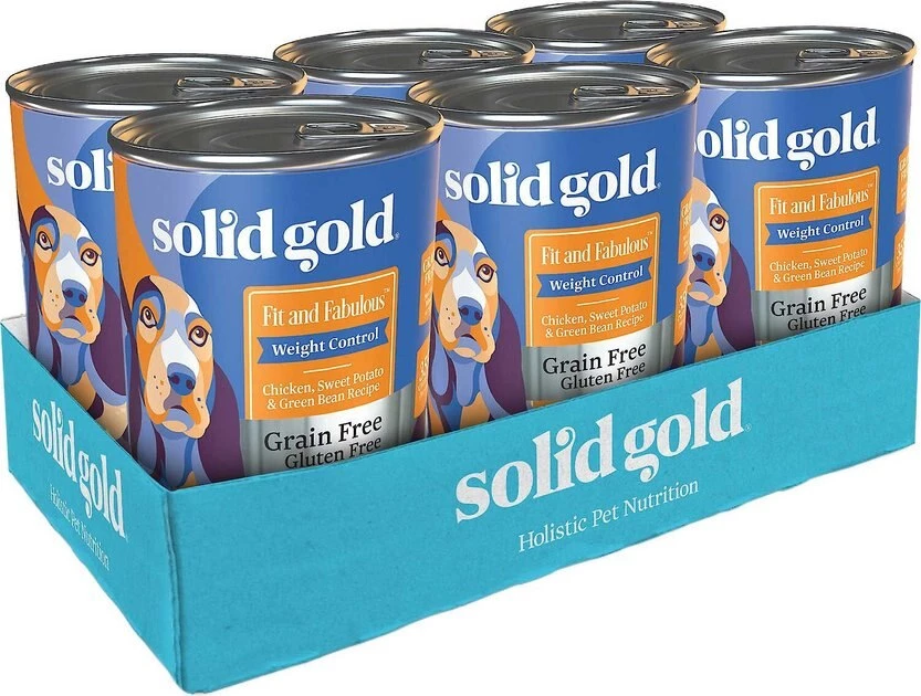 Help your furry friend keep a healthy balance with our Solid Gold Fit & Fabulous Weight Control Grain-Free Chicken, Sweet Potato & Green Bean Dry Dog Food & Solid Gold Fit & Fabulous Chicken, Sweet Potato & Green Bean Weight Control Recipe Grain-Free Canned Dog Food bundle. This low-fat formula is designed for weight control with easy-to-digest all-natural, cage-free chicken, sweet potatoes and green beans. It features a holistic blend of functional superfoods, living probiotics, omega fatty acids and probiotics for gut health and overall immune support. This food also has a natural taste your paw-tner will crave with no soy, wheat or corn. Keep your pup going strong with the wet and dry version of this delicious food!