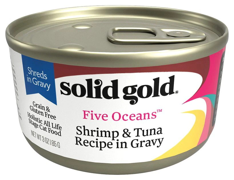 Your feline friend will be purring with joy over the delectable taste of Solid Gold Five Oceans Shrimp and Tuna Recipe Canned Cat Food! Loaded with vitamins and minerals, this grain and gluten free wet cat food provides the complete and balanced nutrition your kitty deserves. It also contains taurine which helps to support healthy vision and a strong heart for cats, and may contribute to normal growth and development for kittens—making this cat food purr-fectly suitable for all life stages! With shrimp and tuna listed in the top 3 ingredients and marinated in a tasty gravy, this Solid Gold cat food is certainly as good as gold!