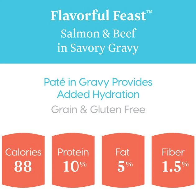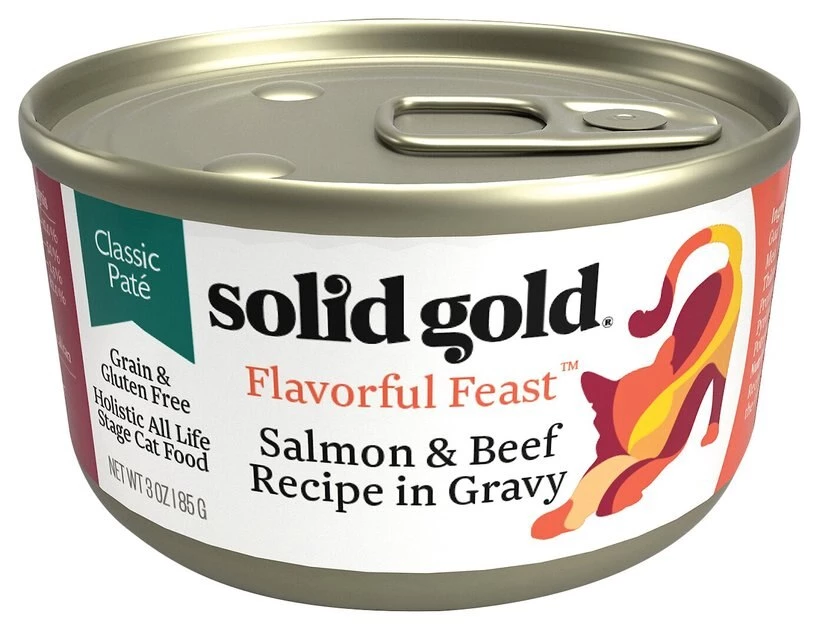 Refine your furry friend’s palate with a bowl of Solid Gold Flavorful Feast in Gravy with Real Salmon & Beef Grain-Free Recipe Canned Cat Food. This grain-free classic pate contains salmon, whitefish, beef liver, salmon broth and beef all listed as the top 5 ingredients! This gluten-free holistic formula is loaded with vitamins and minerals and provides your kitty with the complete and balanced nutrition she deserves. It also contains taurine, which helps to support healthy vision and a strong heart and may contribute to normal growth and development for kittens—making this cat pate purr-fectly suitable for all life stages!