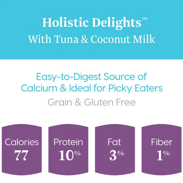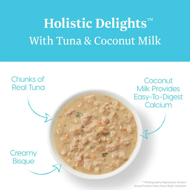 - Holistic formula with high-protein tuna in a paw-licking and filling bisque made with wholesome coconut milk.