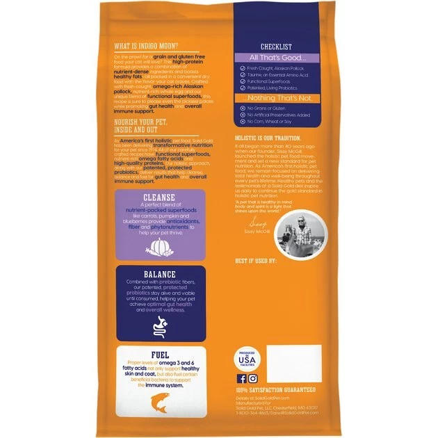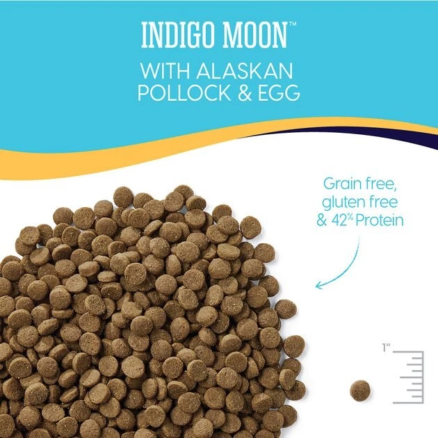 Give your furry friend with a meal sure to please even the pickiest palate with Solid Gold Indigo Moon High Protein Wild Alaskan Pollock & Eggs Recipe Grain-Free Dry Cat Food. It features fresh-caught, omega-rich Alaskan pollock, nutrient-rich whole egg and a unique blend of functional superfoods for a high-protein formula full of nutrient-dense ingredients and healthy fats. This grain and gluten-free food contains fiber-rich peas for a highly digestible energy source with living probiotics and omega fatty acids to cleanse, balance and fuel your paw-tner’s gut health and overall immune support. It is also free of corn, wheat and soy because your kitty deserves nothing but the best. Solid Gold Indigo Moon High Protein Wild Alaskan Pollock & Eggs Recipe Grain-Free Dry Food is ideal for active cats or those with diabetic health concerns.