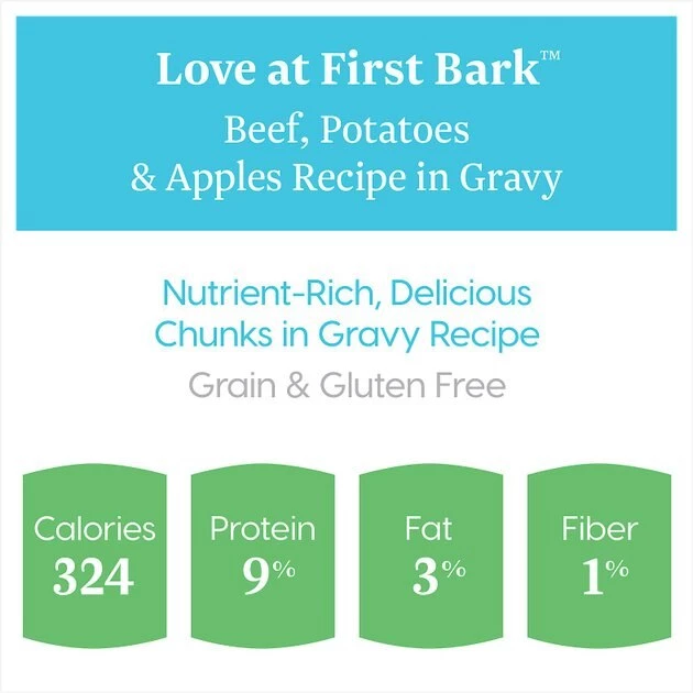 Give your growing puppy love at first bite with the Solid Gold Love At First Bark Beef, Potatoes & Apples Puppy Recipe Grain-Free Canned Dog Food. This highly-digestible formula is made with chunks of beef and beef liver as the top ingredients, along with potatoes and apples in a tasty gravy. It contains carefully balanced levels of vitamins and minerals plus a unique blend of superfoods to help support a strong immune system and healthy bone growth. Plus, it’s loaded with all natural DHA and EPA fatty acids that support overall wellbeing and brain development.