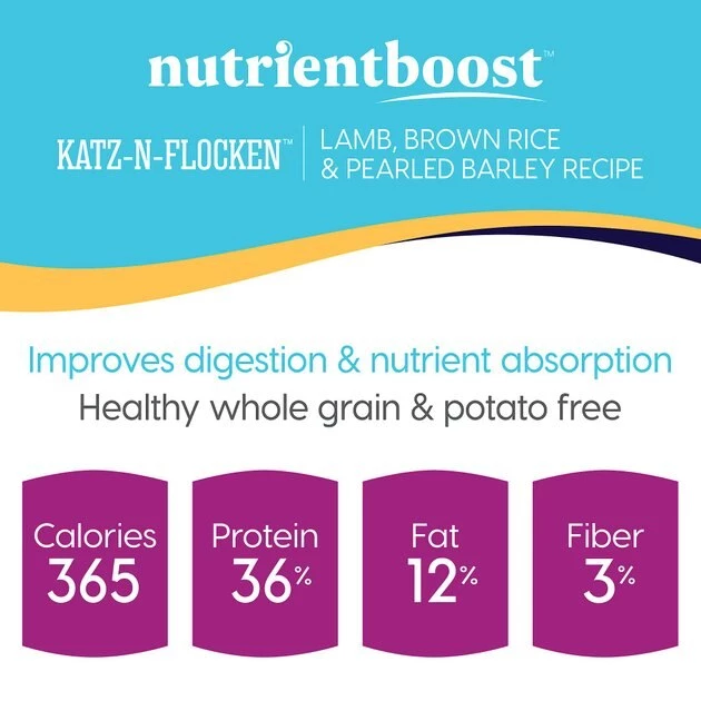 Give your feline friend the purr-fect meal with the Solid Gold NutrientBoost Katz-N-Flocken Dry Cat Food. This dry cat food is made with grass fed lamb for a protein-rich recipe. Its purr-worthy flavor is complemented by nutritious whole grains like pearled barley and brown rice, which is a great source of fiber, B vitamins, and minerals. This recipe also contains a variety of superfoods to support digestive and immune health. Even the most finnicky felines will meow for more!