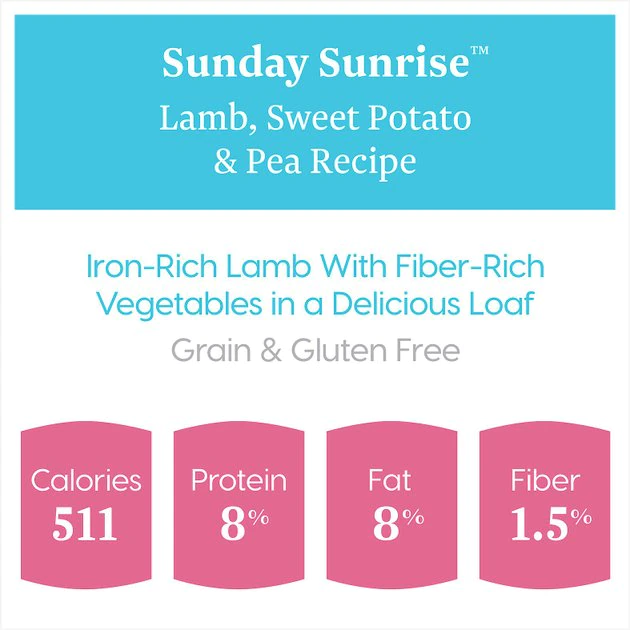 Lamb, Whitefish, Lamb Liver, Lamb Broth, Water Sufficient For Processing, Sweet Potatoes, Peas, Carrots, Pea Fiber, Canola Oil, Guar Gum, Alfalfa Meal, Ground Flaxseed, Salt, Cassia Gum, Xanthan Gum, Potassium Chloride, Spinach, Pumpkin, Cranberries, Choline Chloride, Zinc Proteinate, Iron Proteinate, Blueberries, Apples, Thiamine Mononitrate, Vitamin E Supplement, Copper Proteinate, Manganese Proteinate, Sodium Selenite, Cobalt Proteinate, Niacin Supplement, d-Calcium Pantothenate, Vitamin A Supplement, Riboflavin Supplement, Biotin, Vitamin B12 Supplement, Potassium Iodide, Pyridoxine Hydrochloride, Vitamin D3 Supplement, Folic Acid.
