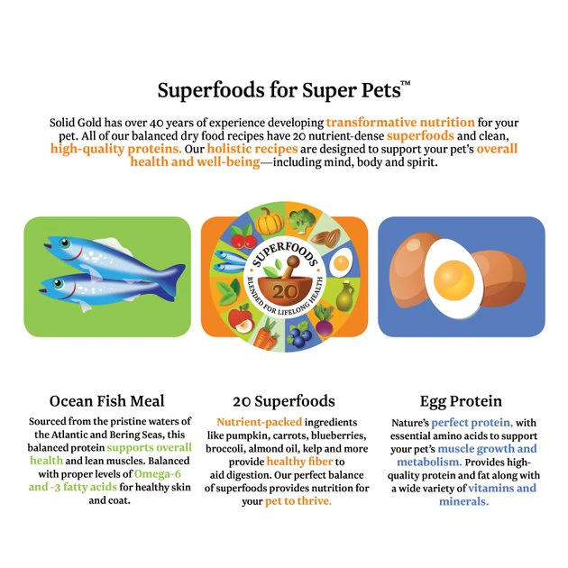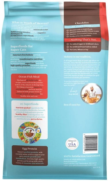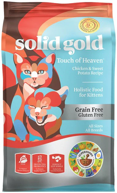 Help your new furry friend achieve her highest potential with the holistic nutrition of Solid Gold Touch of Heave Chicken & Sweet Potato Recipe Kitten Grain-Free Dry Cat Food. Featuring real chicken as the very first ingredient, along with chicken and turkey meals, and wholesome veggies like sweet potatoes, peas and carrots, it’s packed with lean protein and healthy fiber. Formulated with a unique blend of 20 superfoods including cranberries, pumpkin, carrots, blueberries, broccoli, beets, spinach, kelp and more, it’s designed to bring out the best in your little tiger. Ocean Fish meal delivers balanced protein that supports overall health and strong muscle growth with balanced levels of omega fatty acids for a soft, shiny coat. It’s made in the USA with no grains, gluten, artificial preservatives or fillers like corn, wheat and soy.