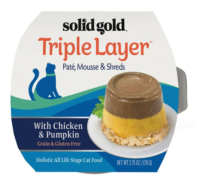 Your kitty never has to choose between pate and shreds again. With Solid Gold Triple Layer, your cat can savor classic pate, whipped mousse and real meat shreds all in one bite! This triple-threat wet food is grain-free, gluten-free, made with real chicken and is a high-quality source of protein. Your cat won’t even know she’s eating a meal that supports her healthy digestion with real pumpkin. Solid Gold Triple Layer gives your kitty all the variety she needs to keep dinner interesting.