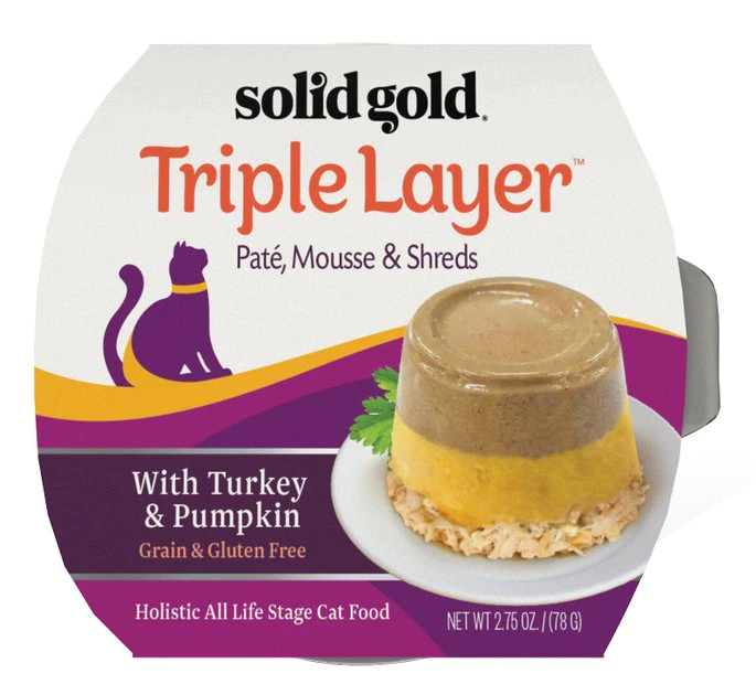 Your kitty never has to choose between pate and shreds again. With Solid Gold Triple Layer, your cat can savor classic pate, whipped mousse and real meat shreds all in one bite! This triple-threat wet food is grain-free, gluten-free, made with real turkey and is a high-quality source of protein. Your cat will love the flavor of fiber-rich pumpkin so much she won’t know she’s eating a meal built to support her healthy digestion. With three, palatable textures, Solid Gold Triple Layer gives your kitty all the variety she needs to keep dinner interesting.