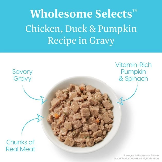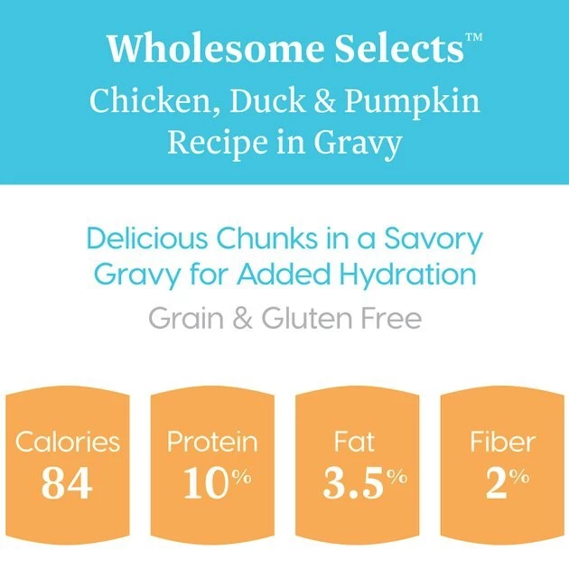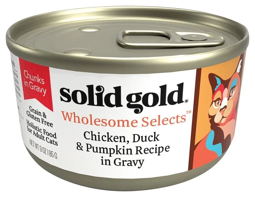 Refine your furry friend’s palate with a bowl of Solid Gold Wholesome Selects with Real Chicken, Duck & Pumpkin Recipe in Gravy Grain-Free Canned Cat Food. This grain-free wet cat food has a hearty chunky texture covered in gravy and contains real chicken, duck, chicken broth, chicken liver and vegetables including pumpkin, spinach and carrots! This gluten-free holistic formula is loaded with vitamins and minerals and provides your cat companion with the complete and balanced nutrition she deserves. It also contains taurine, which helps to support healthy vision and a strong heart for cats, making this cat pate purr-fectly suitable for your adult cat!
