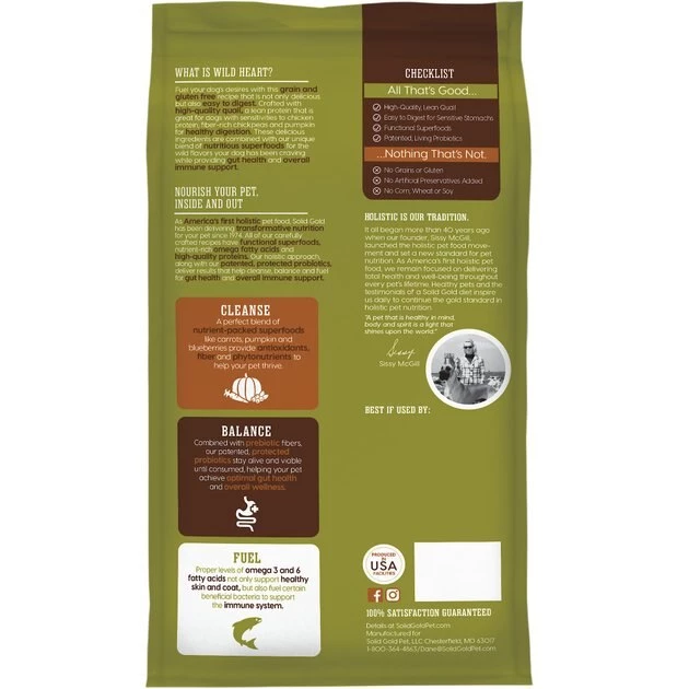 Dogs are always on the hunt for nutritious flavor. Fuel their heart’s desires with this delicious grain and gluten free recipe, crafted with quail for high-quality, lean protein, fiber-rich chickpeas and pumpkin to support healthy digestion. These delicious ingredients are combined with a unique blend of 20 nutritious superfoods for the wild flavors your dog has been craving. Â As America’s first holistic pet food, Solid Gold has over 40 years of experience developing transformative nutrition for your pet. All of our balanced recipes have 20 nutrient-dense superfoods and clean, high-quality proteins. Our holistic approach delivers results that you can see and your dog can feel.